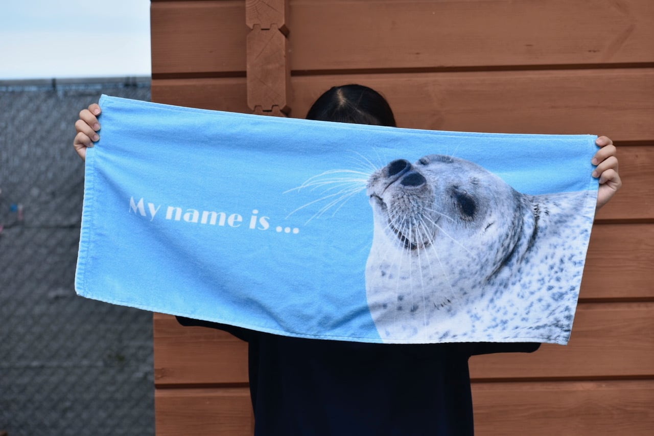とっかりセンターの奇跡のおじいちゃんアザラシといえばアグです!そんなアグのフェイスタオルができました!飼育員の中では、アグは横顔がかっこいい!とのことで、横顔デザインです。